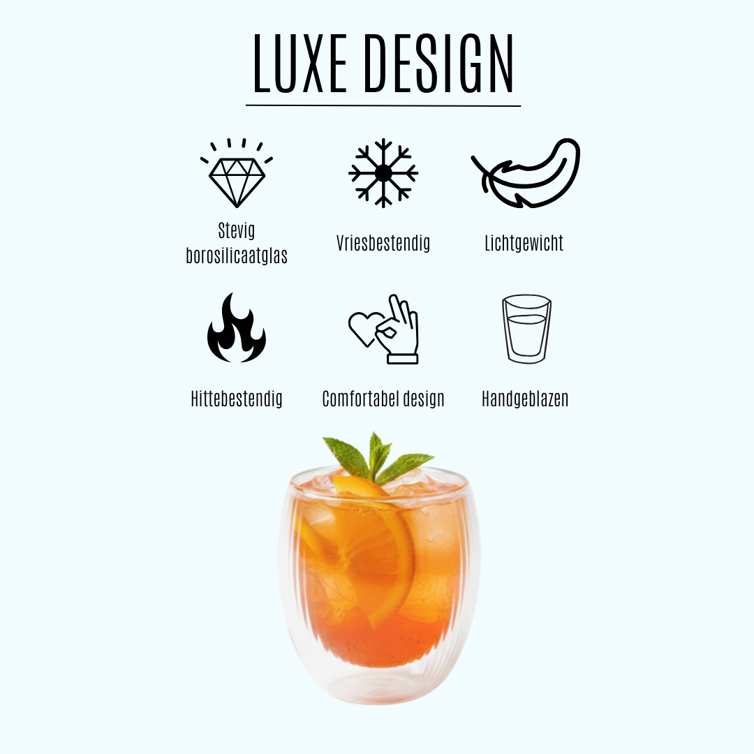 De dubbelwandige glazen zijn echt een gamechanger! Geen warme handen meer en mijn koffie blijft langer op temperatuur. Erg tevreden.